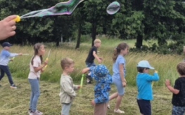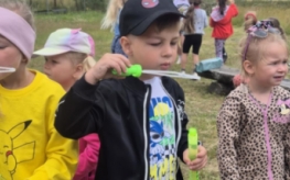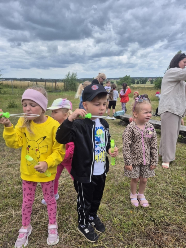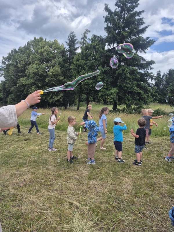 Po części czytelniczej dzieci udały się na świeże powietrze, gdzie w plenerze bawiły się, puszczając kolorowe bańki mydlane. Radości i uśmiechów nie brakowało, a wspólnie spędzony czas na długo pozostanie w pamięci najmłodszych.