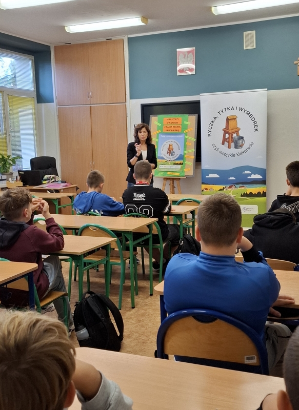 Spotkanie poprowadziła Regina Gruchalska – pasjonatka lokalnej mowy, autorka tekstów i ilustratorka, która z ogromnym zaangażowaniem wprowadziła uczniów w świat regionalnych słów i wyrażeń.