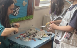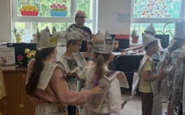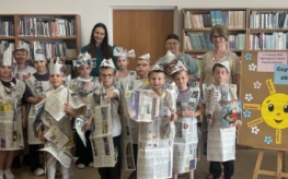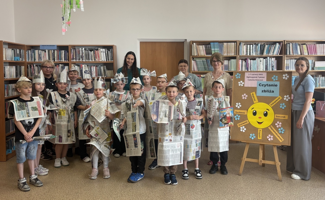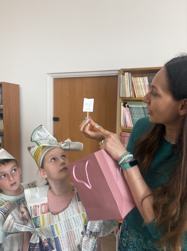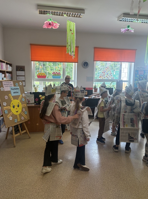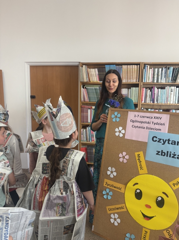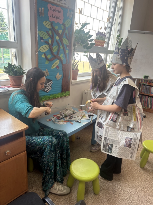 Po wspólnym czytaniu przyszedł czas na zabawę. Chętni uczniowie mogli sprawdzić się w teście na księżniczkę i księcia, próbując przejść z książką na głowie – zadanie wymagało skupienia, równowagi i… sporej dawki śmiechu. Kolejnym punktem spotkania były warsztaty plastyczne, podczas których dzieci, przy wsparciu Pani Bożeny oraz opiekunów, tworzyły stroje z gazet. Dziewczynki zamieniły się w księżniczki, a chłopcy w rycerzy, co okazało się świetną zabawą i prawdziwą eksplozją kreatywności.