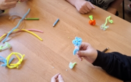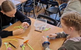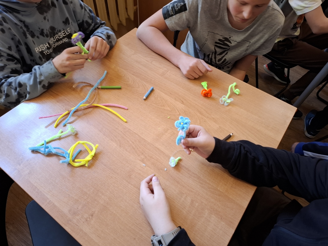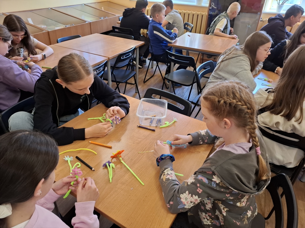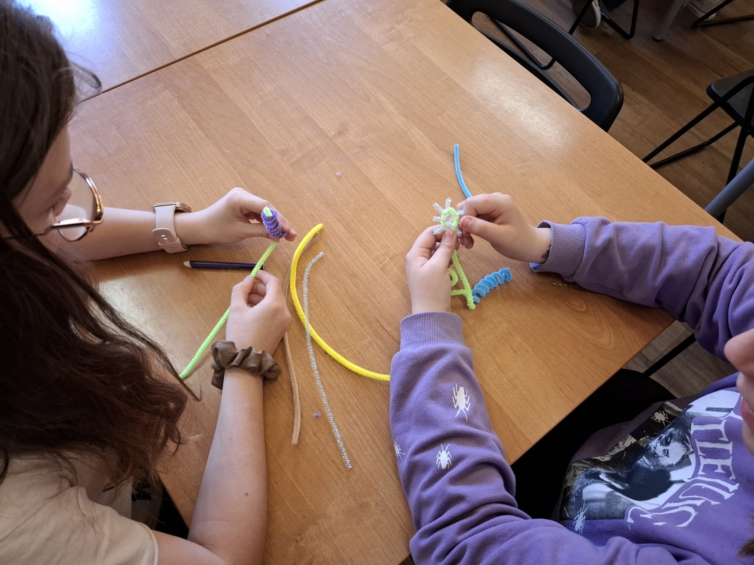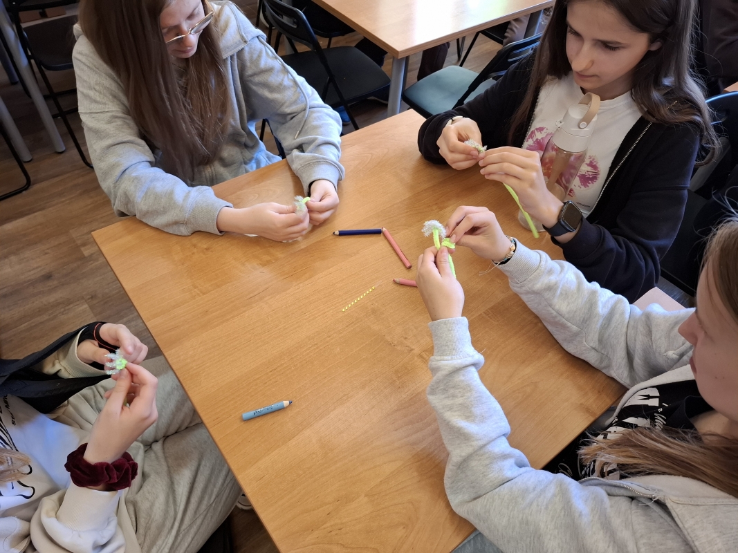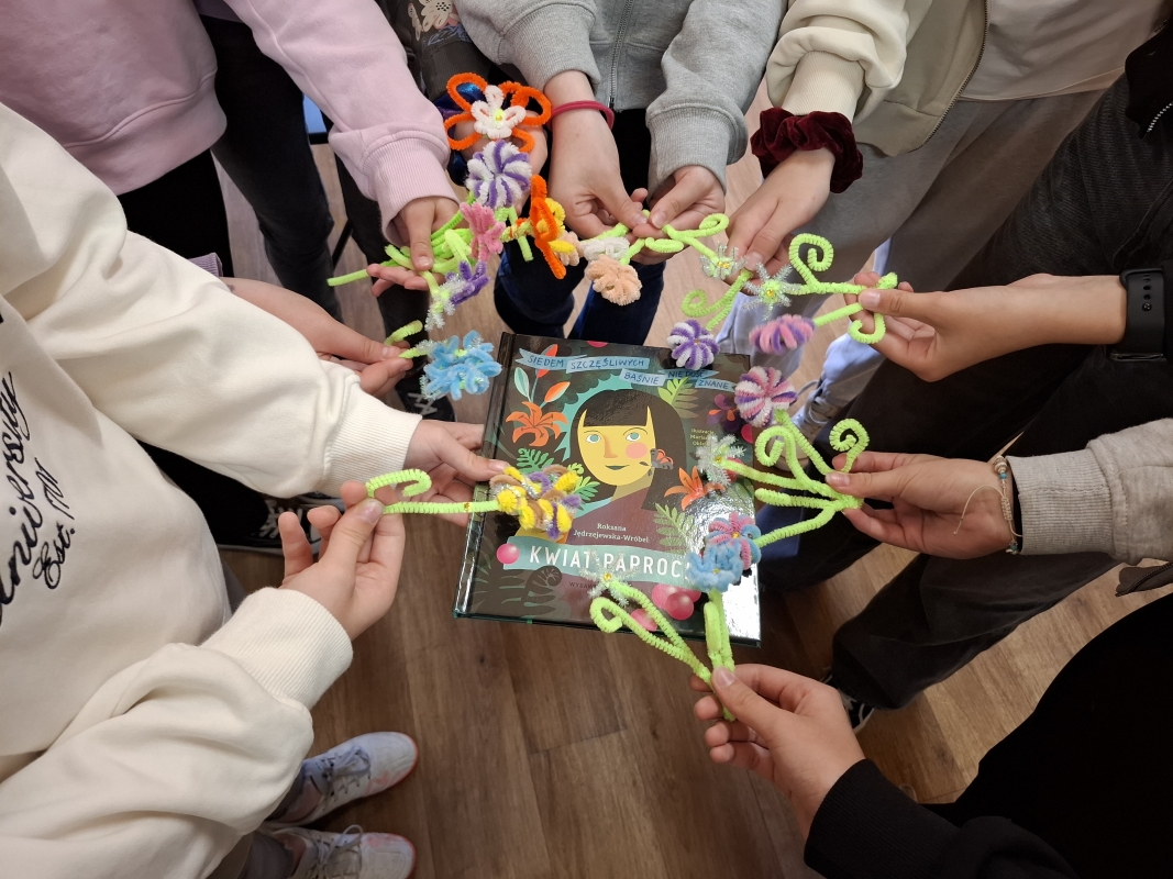 Po części literackiej przyszła pora na działanie pełne kreatywności. Uczniowie spróbowali własnych sił w wykonaniu symbolicznych kwiatów paproci, korzystając z drucików kreatywnych. Kolorowe, fantazyjne formy, które powstały podczas pracy, stały się nie tylko ozdobą, ale też metaforycznym nawiązaniem do poszukiwania tego, co niezwykłe i wartościowe – zarówno w książkach, jak i w sobie samych.