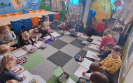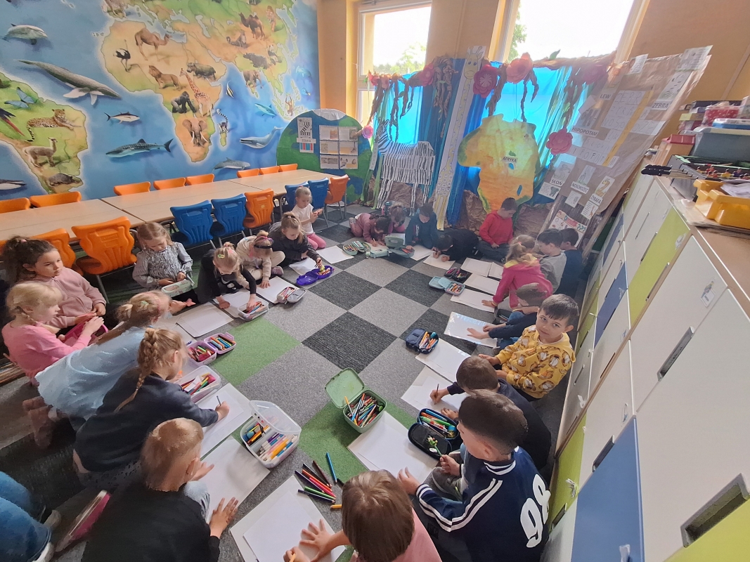 Już od pierwszych chwil spotkania najważniejsze było głośne czytanie – dzieci z ogromnym zainteresowaniem słuchały opowieści, ożywiając je w wyobraźni i reagując z charakterystycznym dla siebie entuzjazmem. Lektura stała się punktem wyjścia do kolejnego etapu zajęć — twórczej pracy plastycznej.