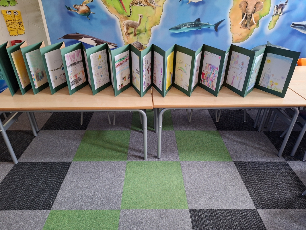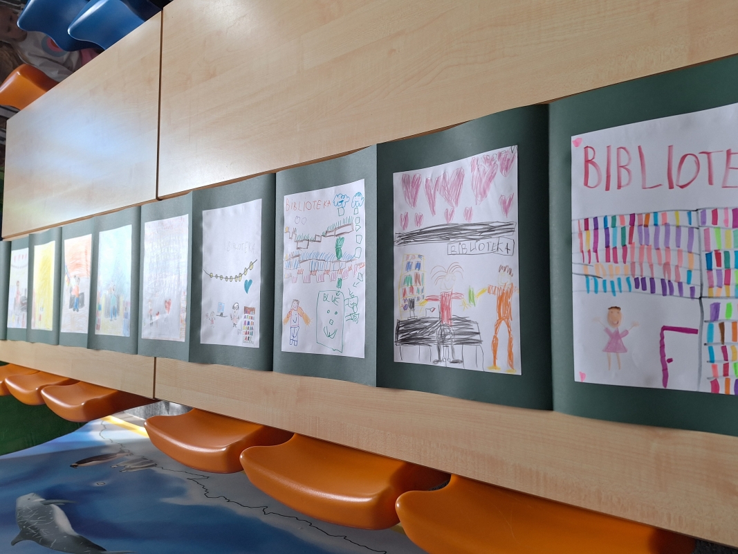 Maluchy z zapałem przystąpiły do rysowania ilustracji inspirowanych hasłem Tygodnia Bibliotek. Z ich barwnych, pełnych pomysłów prac powstała wyjątkowa książka-harmonijka, którą można było z dumą podziwiać po zakończeniu zajęć. Dla wielu z nich była to pierwsza okazja, by współtworzyć prawdziwą, choć nietypową, książkę.