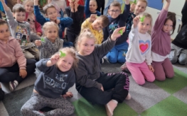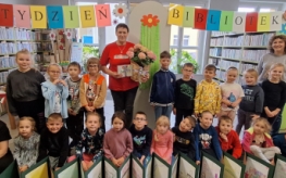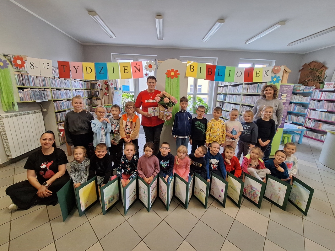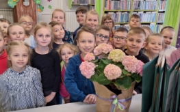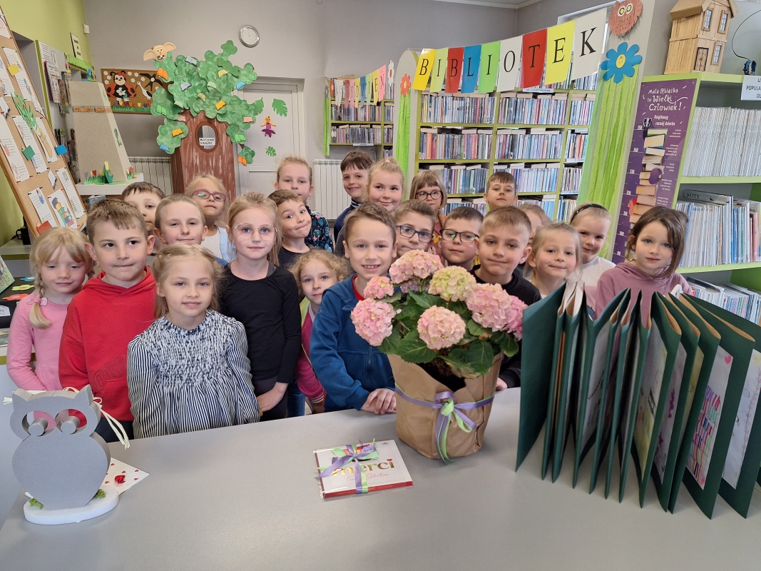 Na koniec spotkania dzieci sprawiły bibliotekarce niezwykłą niespodziankę — z serdecznością i śmiałością zaśpiewały „Sto lat”, złożyły życzenia oraz wręczyły kwiat w doniczce i słodki upominek. Był to wzruszający moment, który pięknie podsumował ciepłą i pełną życzliwości atmosferę całego wydarzenia.