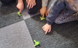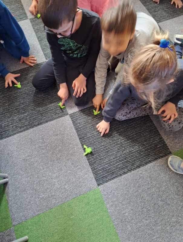 Kiedy ilustracje były już gotowe, przyszedł czas na chwilę beztroskiej zabawy. Ogromnym powodzeniem cieszyły się papierowe żabki, które skakały, lądowały, przewracały się i wywoływały mnóstwo śmiechu.