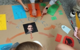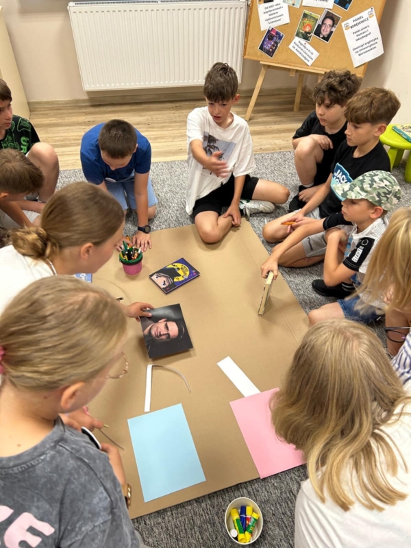 Kolejnym etapem spotkania była praca warsztatowa. Podzieleni na grupy uczniowie wykorzystali zdobytą wiedzę, aby stworzyć plakaty inspirowane twórczością pisarza. Każda grupa zaproponowała własną interpretację jego książek – pojawiły się zarówno nawiązania do konkretnych bohaterów i historii, jak i próby uchwycenia ogólnego przesłania oraz wartości obecnych w utworach autora.