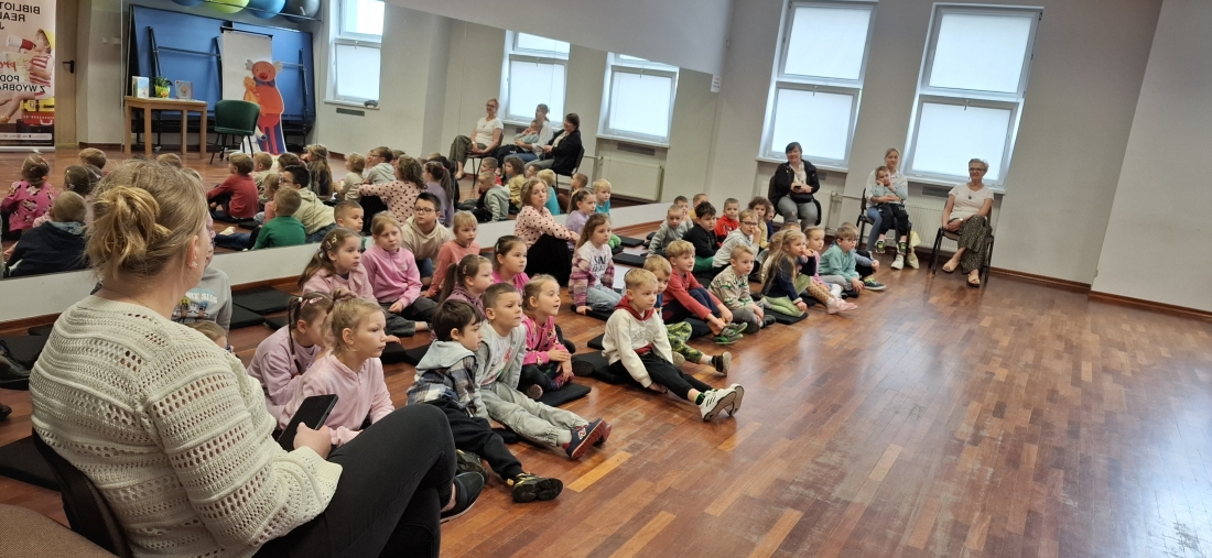 Już od pierwszych chwil w sali unosiła się energia i dziecięca ciekawość. Przedszkolaki chętnie opowiadały o swoich ulubionych bohaterach – nie tylko o uroczym Wesołym Ryjku, ale także o świetnie znanym im Panu Kuleczce, którego historie towarzyszą im na co dzień. Ich spontaniczne komentarze, pytania i entuzjazm sprawiły, że rozmowa z autorem stała się pełna żywych emocji i uśmiechu.