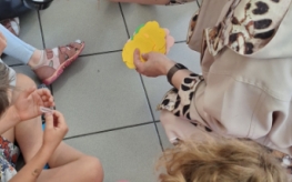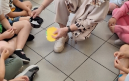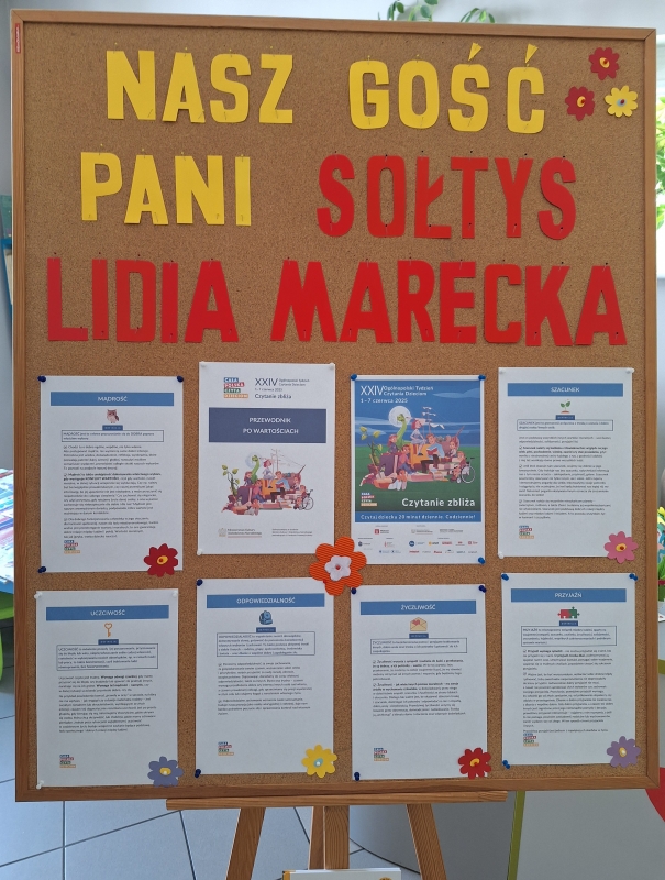 Podczas spotkania dzieci rozmawiały o takich wartościach jak szacunek, uczciwość, odpowiedzialność, mądrość, życzliwość i przyjaźń. Następnie każde dziecko losowało karteczkę z jedną z wartości i przyklejało ją na przygotowany przez Panią Lidkę kwiatek. Na swoim kwiatku dzieci rysowały to, jak rozumieją wybraną wartość.