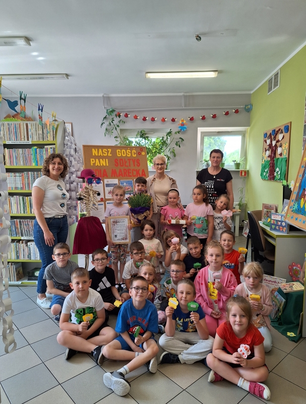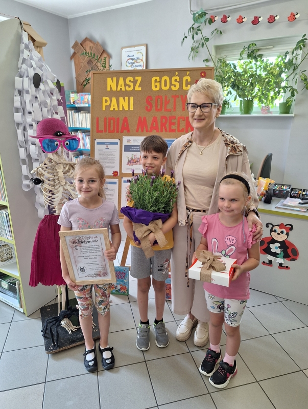 Na zakończenie spotkania mali goście pięknie podziękowali Pani Lidii Mareckiej, wręczając jej kwiaty i czekoladki. Pani Sołtys również miała dla dzieci niespodziankę – lizaki i cukierki, które wywołały wiele radości i uśmiechów.