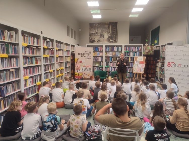 W spotkaniu uczestniczyli uczniowie klas IIIc ze Szkoły Podstawowej nr 2 w Jarocinie oraz IIIb ze Szkoły Podstawowej nr 5 w Jarocinie, którzy odwiedzili bibliotekę w ramach projektu „Podróże z wyobraźnią”.