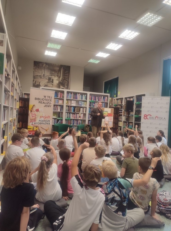 Już od pierwszych minut dało się zauważyć ogromne zainteresowanie młodych czytelników. Dzieci z zaciekawieniem słuchały opowieści autora o powstawaniu książek, bohaterach i pomysłach czerpanych z codziennych sytuacji. Chętnie zadawały pytania – nie brakowało tych bardzo poważnych („skąd bierze się pomysł na historię?”), jak i całkiem zabawnych. Spotkanie szybko zamieniło się w żywą rozmowę pełną śmiechu i spontanicznych reakcji.