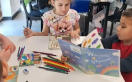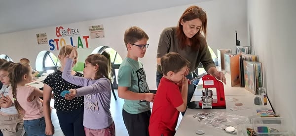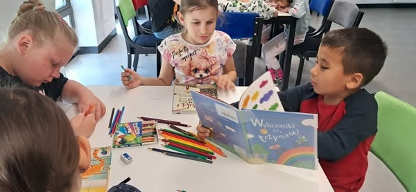 Atmosfera spotkania sprzyjała współpracy, swobodnej wymianie myśli i radości z tworzenia. Dzieci z ogromnym zaangażowaniem dobierały kolory, bawiły się symbolami i przekładały wrażenia z lektury na własny język plastyczny. Co najważniejsze – projektowanie przypinek okazało się nie tylko warsztatem manualnym, ale również świetnym sposobem na pogłębienie kontaktu z literaturą.