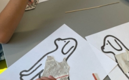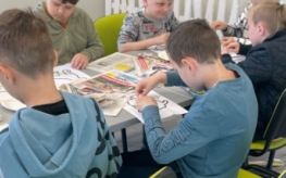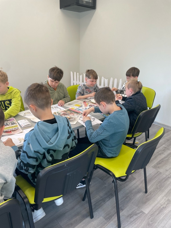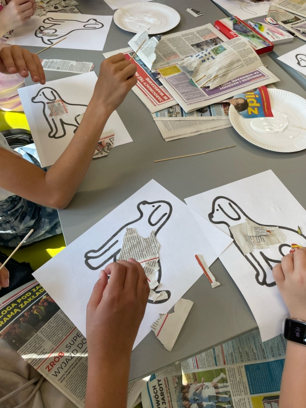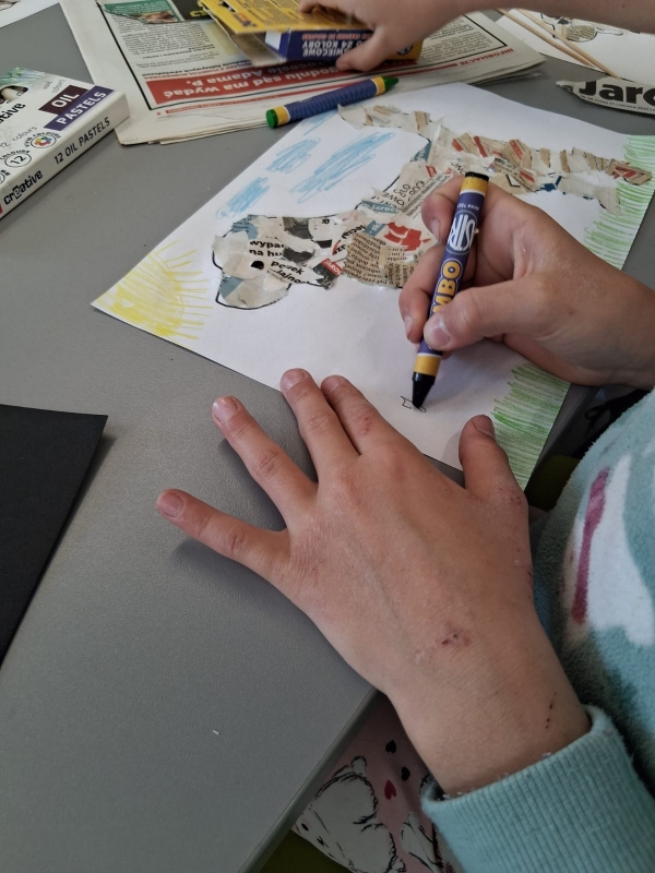 Kolejnym etapem warsztatów była część artystyczna. Dzieci, korzystając z techniki wyklejania z gazet, stworzyły niepowtarzalne portrety Elfa – bohatera, który w ich wyobraźni zyskał unikatowe cechy, barwy i emocje. Powstałe prace zachwycały różnorodnością i pomysłowością, a przede wszystkim pokazywały, jak wiele radości daje tworzenie czegoś własnymi rękami.