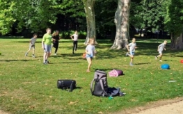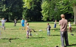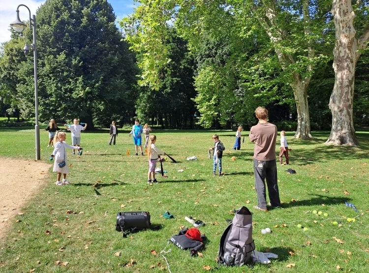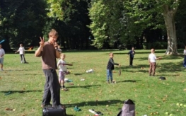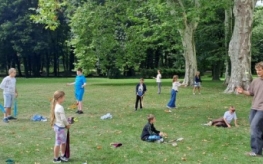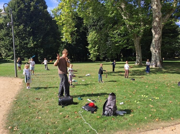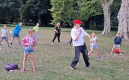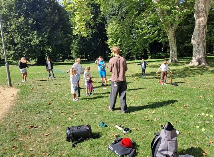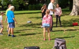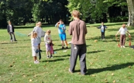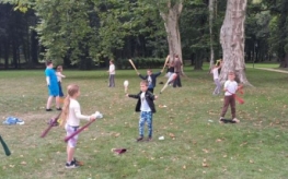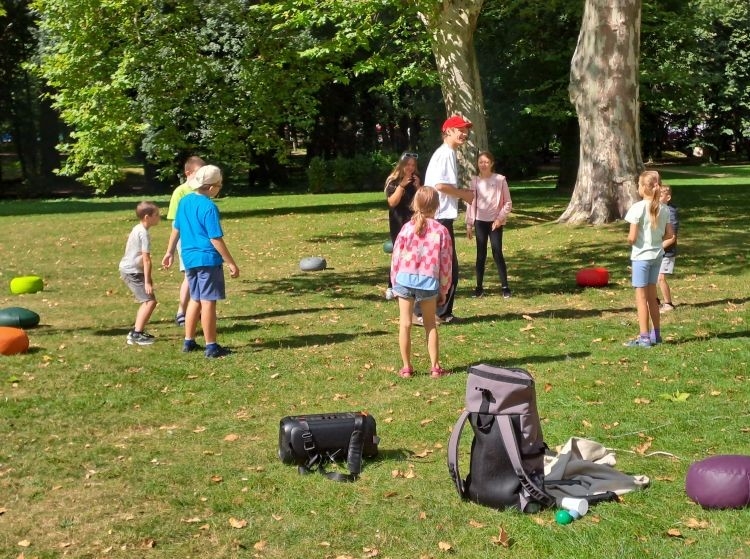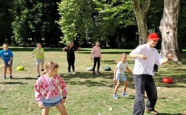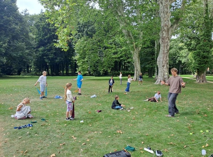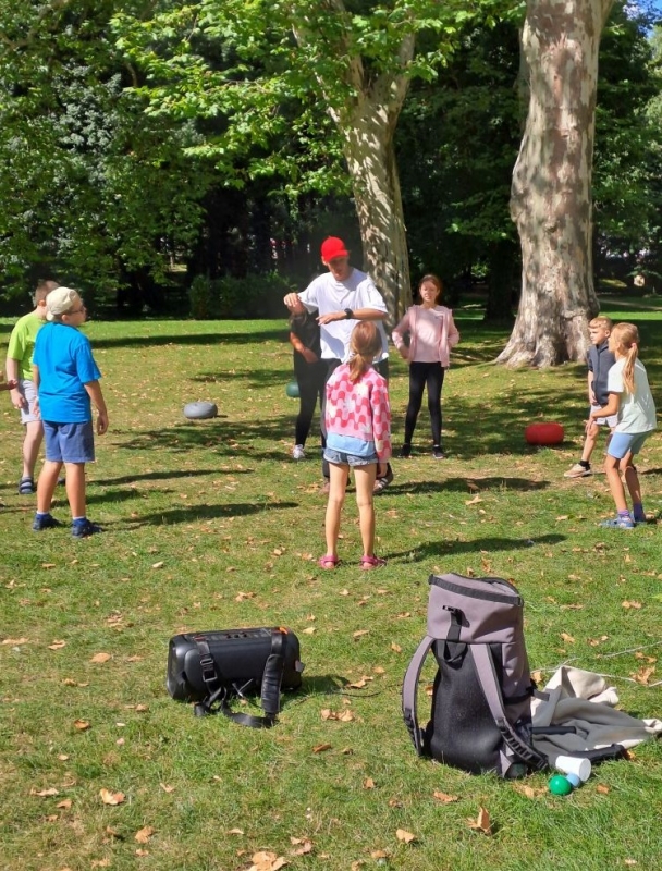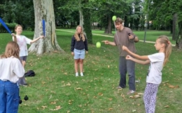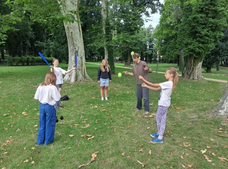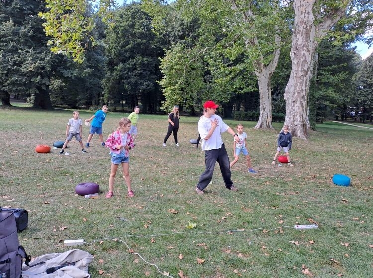 Podczas warsztatów kuglarskich z panem Jakubem uczestnicy uczyli się żonglowania przy dźwiękach muzyki pop. Dzieci korzystały z poików – piłeczek na sznureczkach i łańcuszkach – dzięki którym pierwsze kroki w żonglerce okazały się łatwiejsze i mniej stresujące. Radość z nauki i satysfakcja z kolejnych udanych prób były widoczne na każdej twarzy.