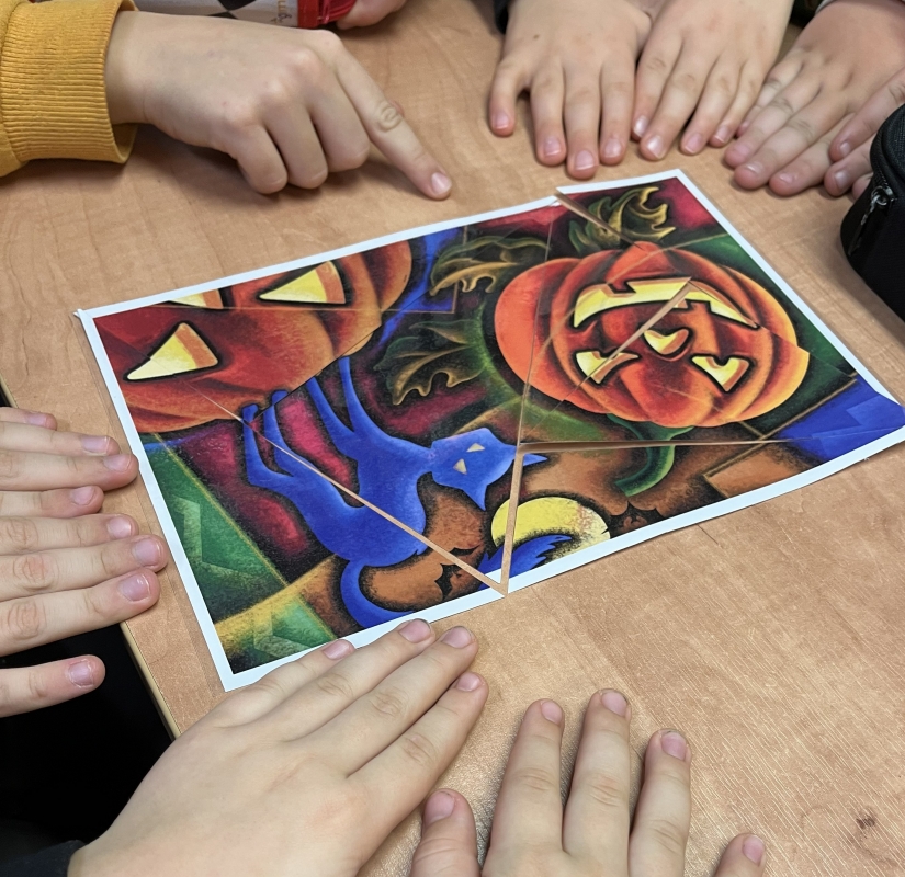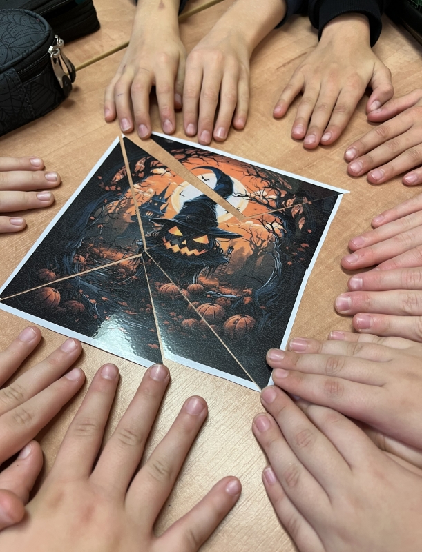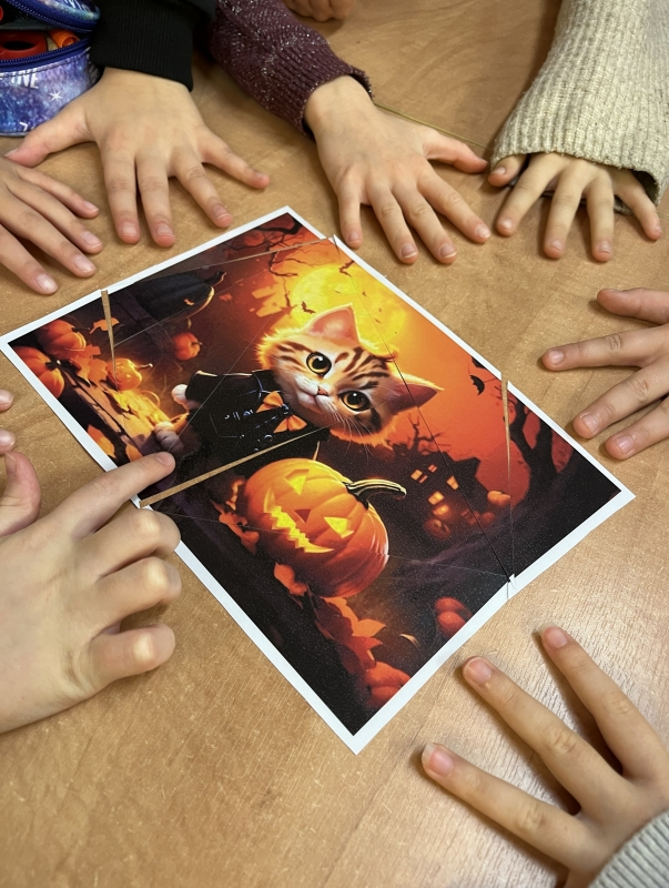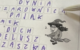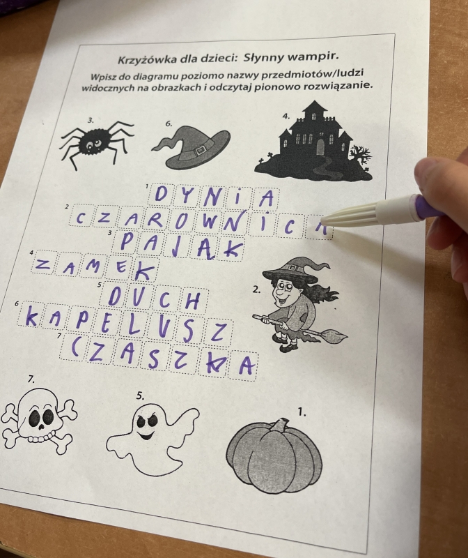 Dodatkową atrakcją było układanie tematycznych puzzli oraz rozwiązywanie halloweenowej krzyżówki, która sprawdziła spostrzegawczość i znajomość nowych słów związanych z tym świętem.