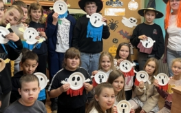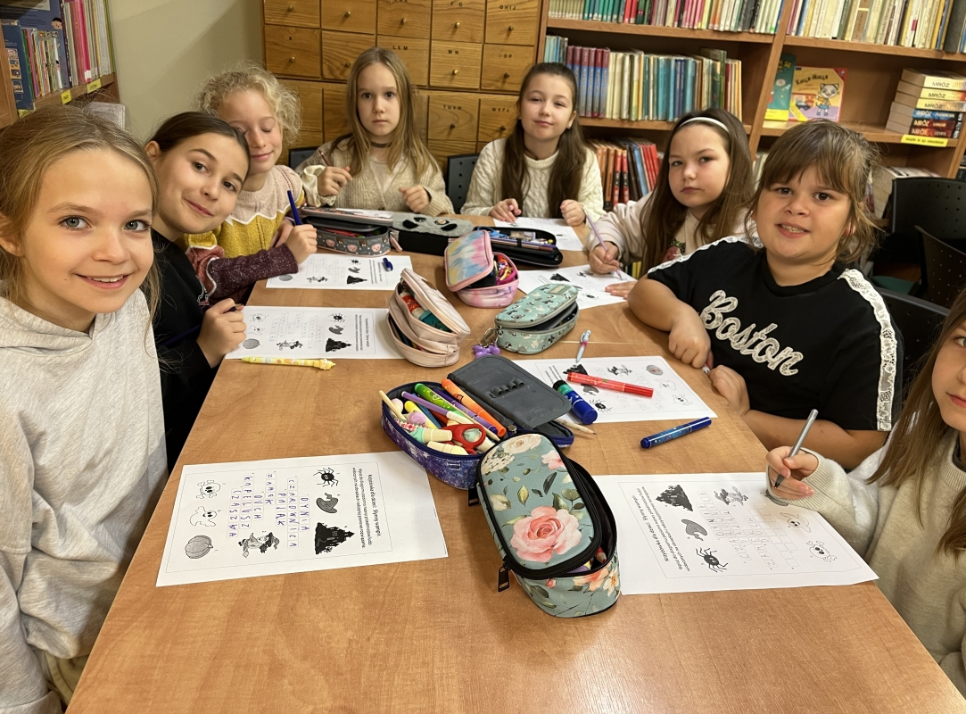 Uczniowie rozpoczęli wizytę od zapoznania się z książkami nawiązującymi do motywów Halloween – nie zabrakło opowieści z nutą dreszczyku, zabawnych historii o duchach oraz ciekawostek dotyczących tradycji tego święta. Rozmowa o zwyczajach i symbolach związanych z Halloween stała się inspiracją do dalszych działań.