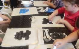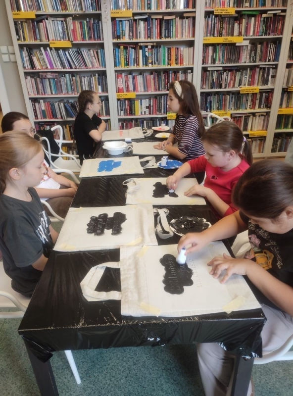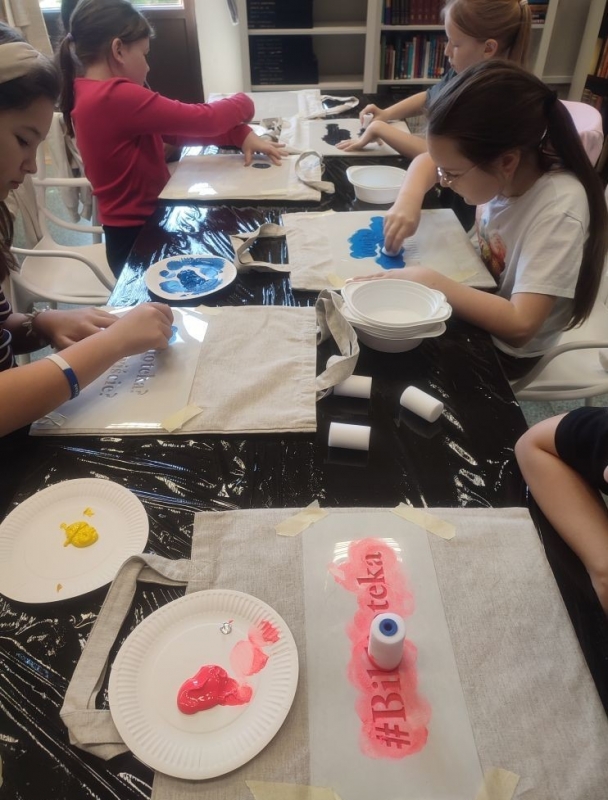 Kolejnym punktem programu były warsztaty kreatywne. Uczniowie mieli okazję samodzielnie ozdobić bawełniane torby, wykorzystując przygotowane szablony z hasłami promującymi bibliotekę i czytelnictwo. Powstały wyjątkowe, spersonalizowane projekty – kolorowe, odważne i pełne pomysłowości. To nie tylko praktyczna pamiątka z wizyty, ale także sposób na zabranie cząstki biblioteki ze sobą.