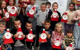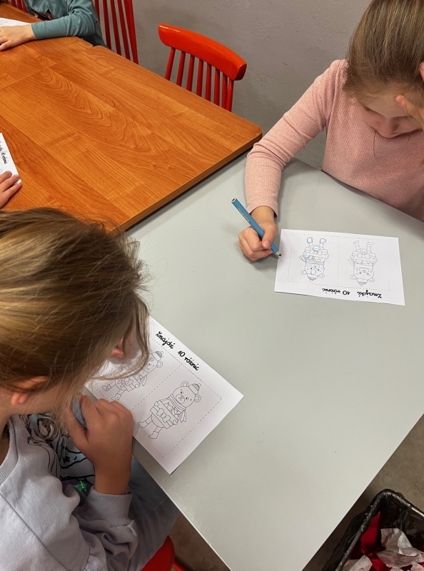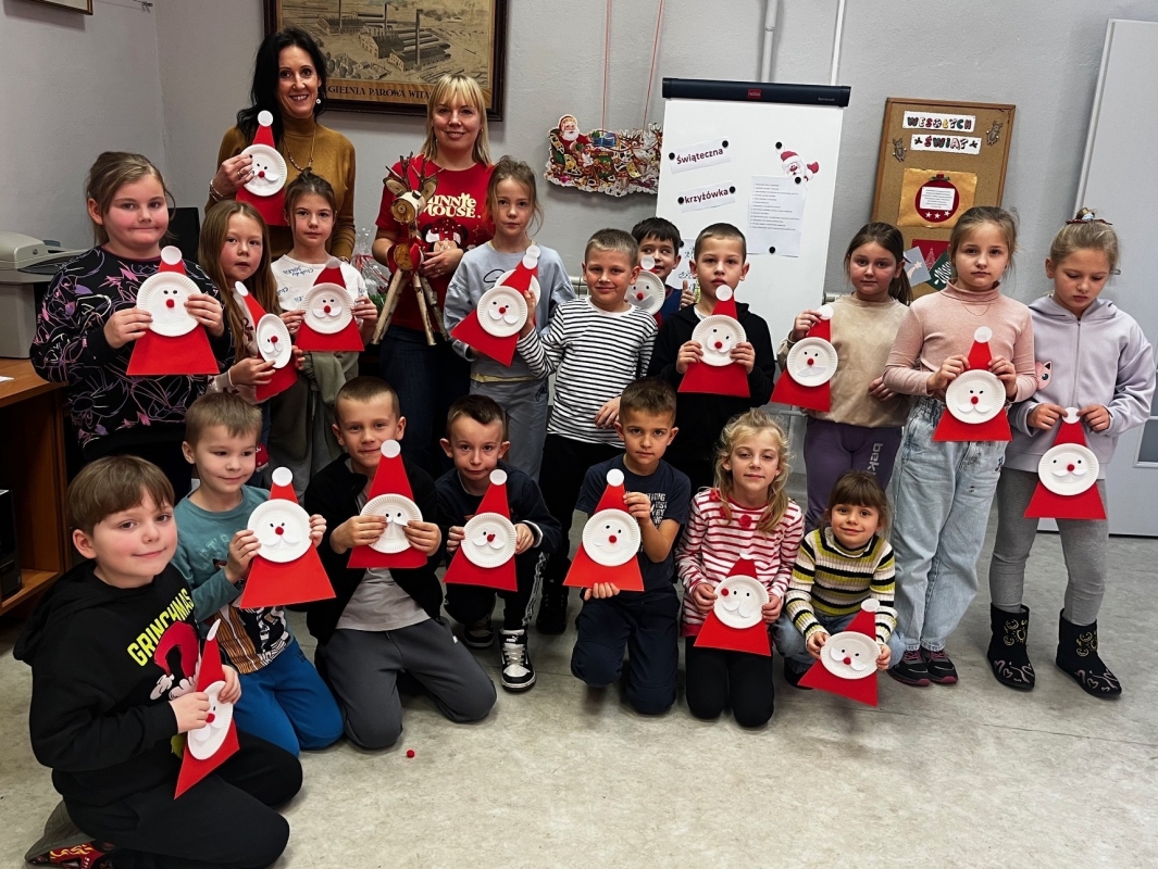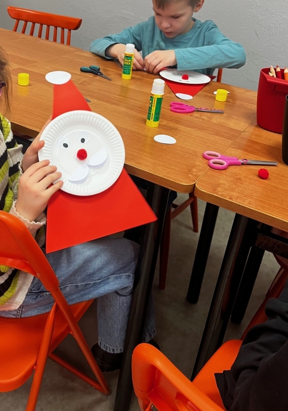 Kulminacyjnym punktem spotkania była część plastyczna. Z przygotowanych materiałów dzieci wykonały własnoręcznie świąteczne mikołaje, które – jak zapowiedziały – ozdobią stoły podczas klasowej wigilii. Była to doskonała okazja do rozwijania wyobraźni i zdolności manualnych.